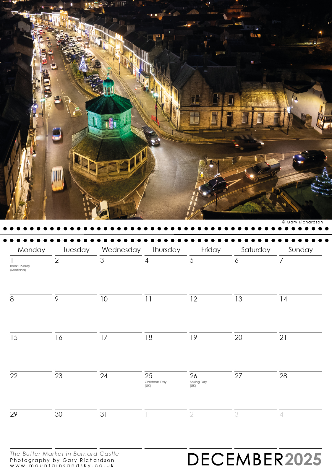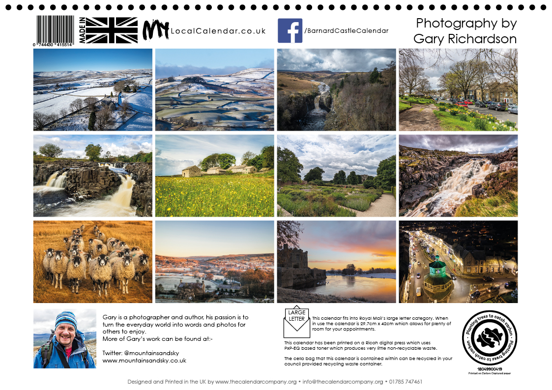 A double A4 size wire bound calendar (opens out to A3 size for display) beautifully printed on high-quality card and featuring twelve images from around the beautiful market town of Barnard Castle in County Durham.