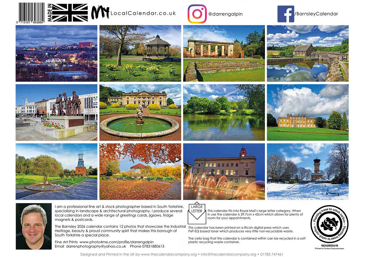 The Barnsley 2026 calendar contains 12 stunning views illustrating the great variety of scenery within the Towns boundaries. Every picture is A4 in size and opens out to A3 size when hung on a wall using the tab for easy flipping between the different months. Each monthly page contains all bank holidays and important dates with room to write in each daily space. The calendar comes wrapped in cellophane and with its own sturdy card envelope. Perfect to send as a Christmas gift or special occasion to friends and family near or far away.