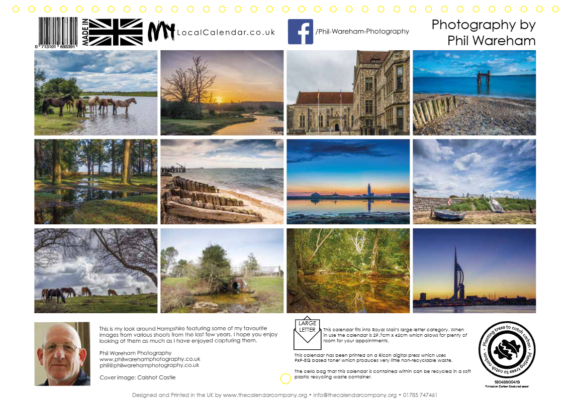 A double A4 calendar featuring 13 different images from around the county of Hampshire photographed by local photographer Phil Wareham.