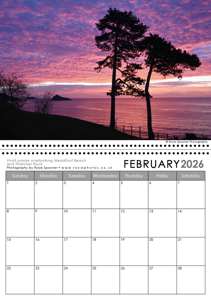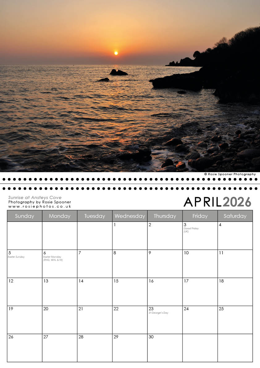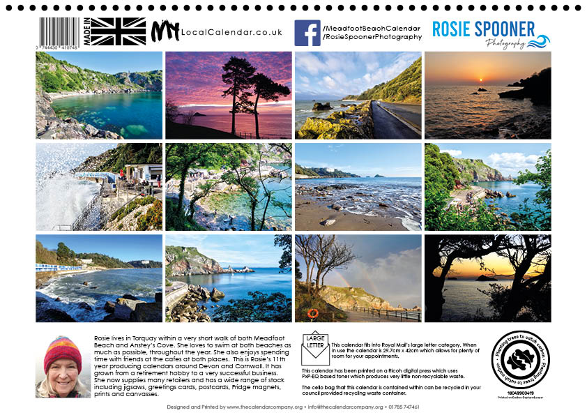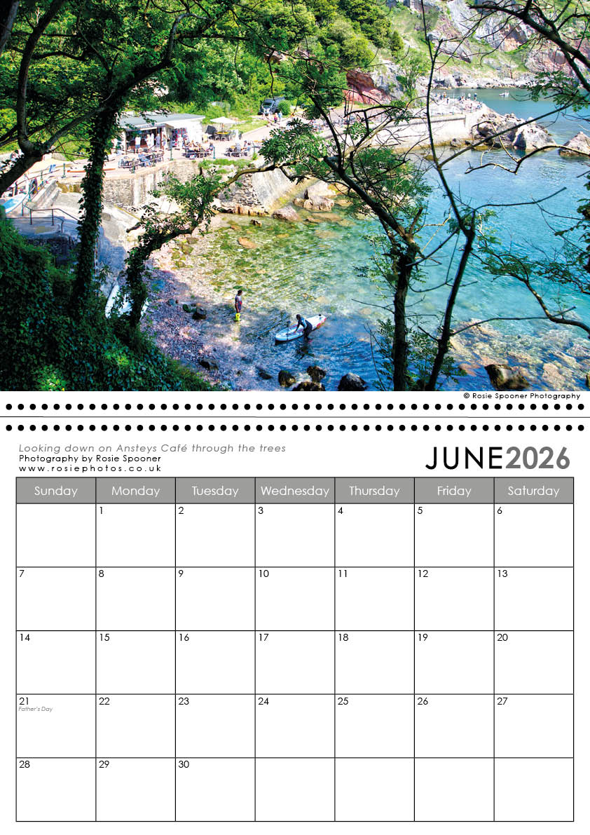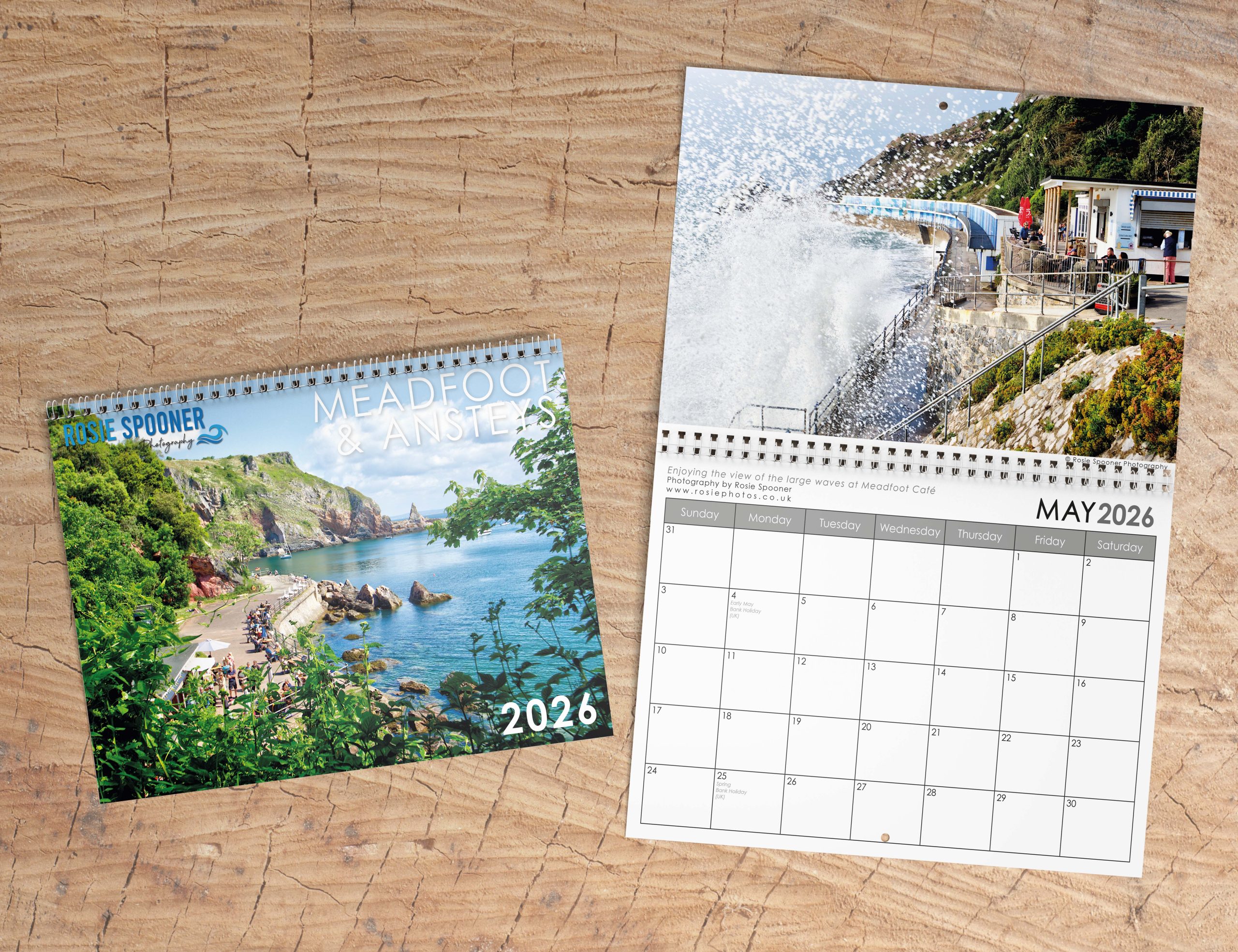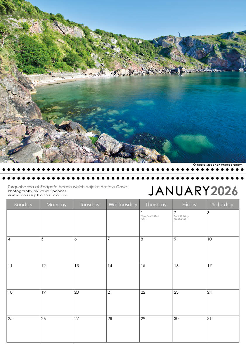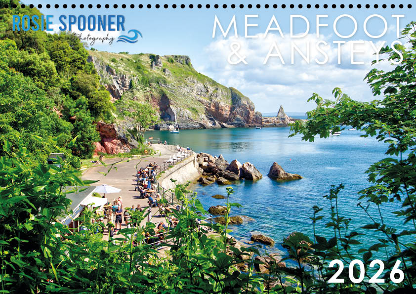 Meadfoot and Ansteys Cove Calendar 2026. This is the version with Anstey’s Cove on the front. There is also a version with Meadfoot Beach on the front. Twelve original photos by Rosie Spooner Photography, six of Meadfoot and six of Anstey’s Cove.